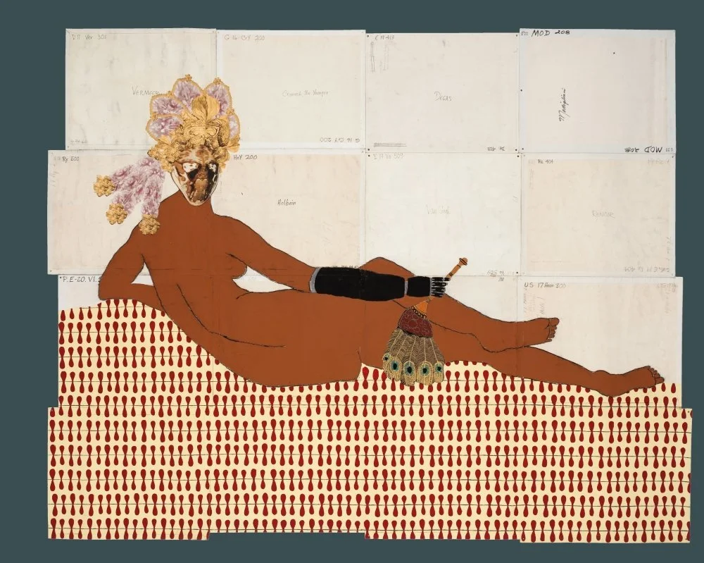 Cover of Katherine Sherwood: In the Garden of the Yelling Clinic (2022), featuring the painting After Ingres (2014). Mixed media on found cotton duck, 84 x 105 inches.